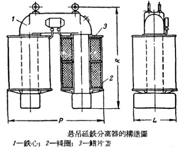 球磨機(jī)運(yùn)轉(zhuǎn)中所用的懸吊磁鐵分離器則主要由一些馬蹄形的鐵心構(gòu)成,其上繞有線圈,而下段裝有的端部。經(jīng)過(guò)此設(shè)備分離出來(lái)的金屬塊會(huì)在人工作用除去,具體結(jié)構(gòu)如下: