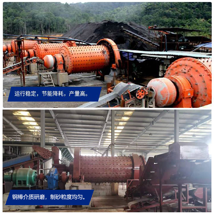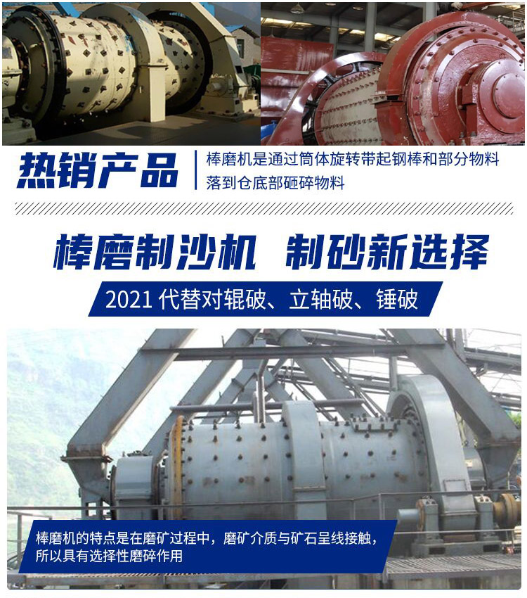 二、出料均勻產量高——采用先進的可控進出料棒磨機技術,結合實際用戶的研磨物料配用合適的研磨體,一改傳統(tǒng)球磨機的面接觸為線接觸,使制砂機的出料粒度更為均勻、產量更高, 適用于不同硬度(莫氏硬度 5.5 ~ 12 )的礦石。